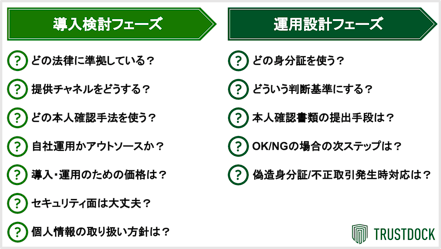 eKYCソリューションの導入を検討されている企業の方々や、実際に導入プロジェクトを担当されている方々のために、TRUSTDOCKではPDF冊子「eKYC導入検討担当者のためのチェックリスト」を提供しており、eKYC導入までの検討フローや運用設計を行う上で重要な検討項目等を計12個のポイントにまとめていますので、ぜひご活用ください。
