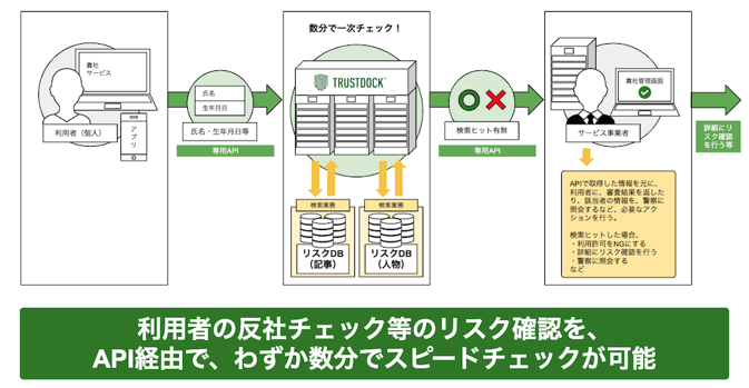 さらに、昨今高まるコンプライアンスのリスクについても、TRUSTDOCKではスピード重視の「スピードリスクチェックAPI」を提供しています。