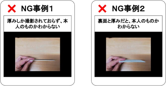 後者の運転免許証等については、その表面だけでなく裏面及び厚みの画像の送信を受け、マイナンバーカードであれば表面及び厚みの画像の送信を受けることが必要です(マイナンバーカード裏面には個人番号が記載されているので、送信を受けないように注意する必要があります)。