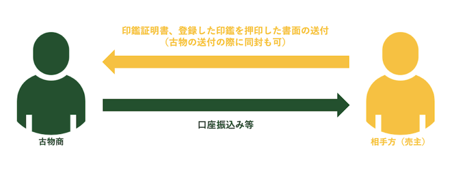 - 本人限定受取郵便物等で梱包材を送付し、その梱包材に梱包して古物を送付させる方法(古物商が送付した梱包材と相手方から送付を受けた古物の梱包材との同一性が判断できるように、自社専用で第三者が入手できない梱包材を使用する。梱包材に個別の番号を付しておくなどの措置が必要です。)