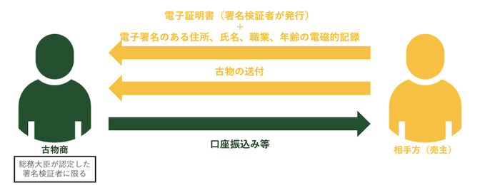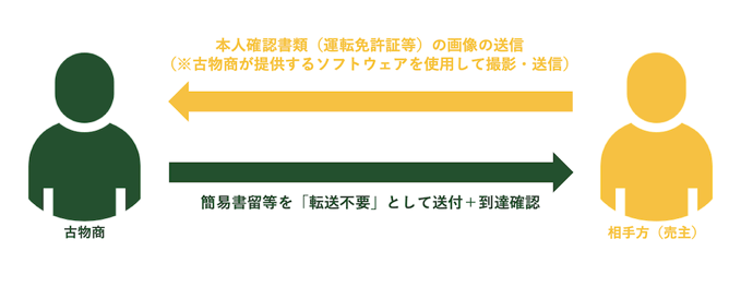 2018年4月公布の改正古物営業法によって、非対面取引における本人確認方法が追加されました。物理的な書面の郵送対応のほか、インターネット等を活用したeKYCによる手法も明記されています(eKYCについてはこちらの記事を参照)。