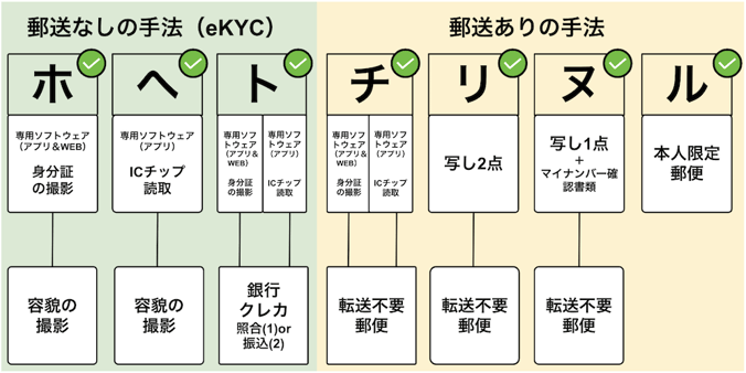 「チ」「リ」「ヌ」については、元々は「本人確認書類の写し1点の送付と転送不要郵便」の対応のみでよかったのですが、2018年公布の改正犯収法によって、厳格化する形で3つの手法に分化されました。