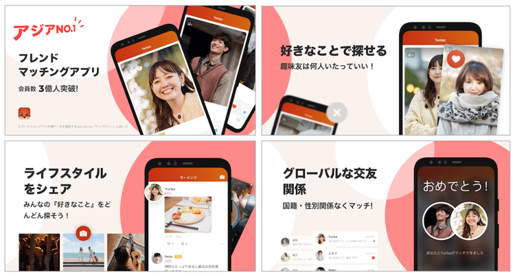 「Tantan(タンタン)」は、趣味や好きなことを一緒に楽しめる友達が欲しい人のためのマッチングアプリ。ユーザーの現在地や距離、性格、好みをもとに、リアルタイムで近くにいるお相手が表示され、それに対して左右スワイプで「お気に入り」もしくは「パス」を意思表示する。互いにお気に入りスワイプがされるとマッチングとなり、メッセージ等のやりとりが可能となる。。