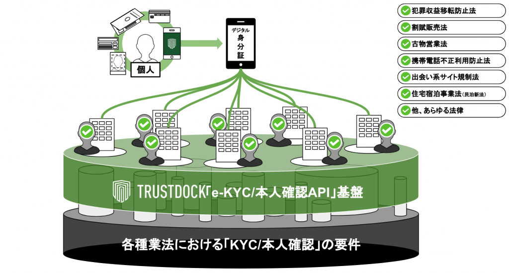 KYC as a Service「TRUSTDOCK」が提供している、日本で唯一のe-KYC/本人確認APIサービスでは、犯罪収益移転防止法をはじめ、携帯電話不正利用防止法、古物営業法、出会い系サイト規制法、民泊新法など、各種法律に準拠したKYCをAPI組み込みのみで実現します。
