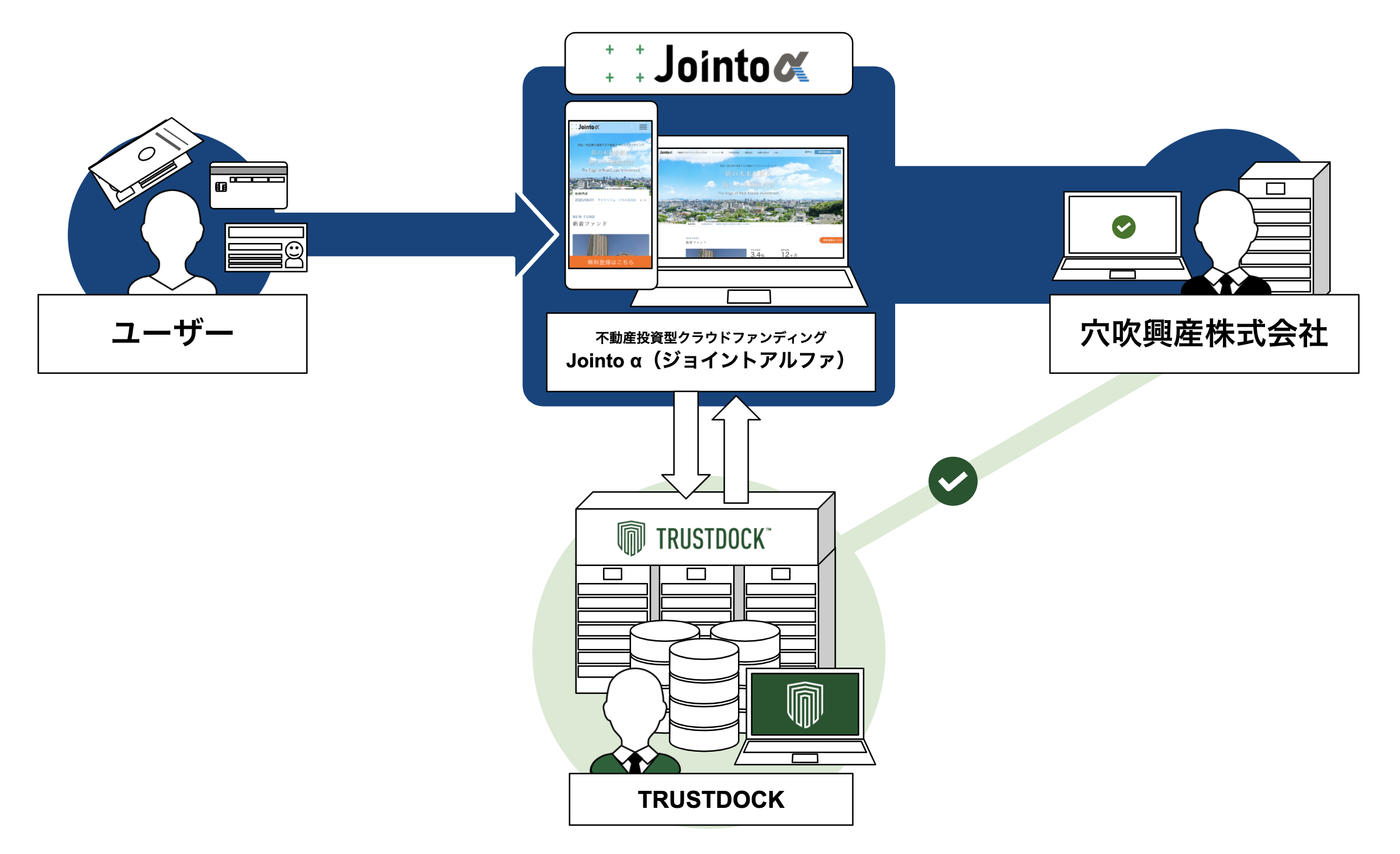 株式会社TRUSTDOCK(本社:東京都千代田区、代表取締役:千葉 孝浩、以下 TRUSTDOCK)は、本人確認業務の代行において穴吹興産株式会社(本社:香川県高松市、代表取締役:穴吹 忠嗣 以下 穴吹興産)と業務提携し、同社が展開する、不動産投資型クラウドファンディング「Jointo α(ジョイントアルファ)」において、本人確認APIサービス「TRUSTDOCK」の導入実施を完了したことをご報告します。