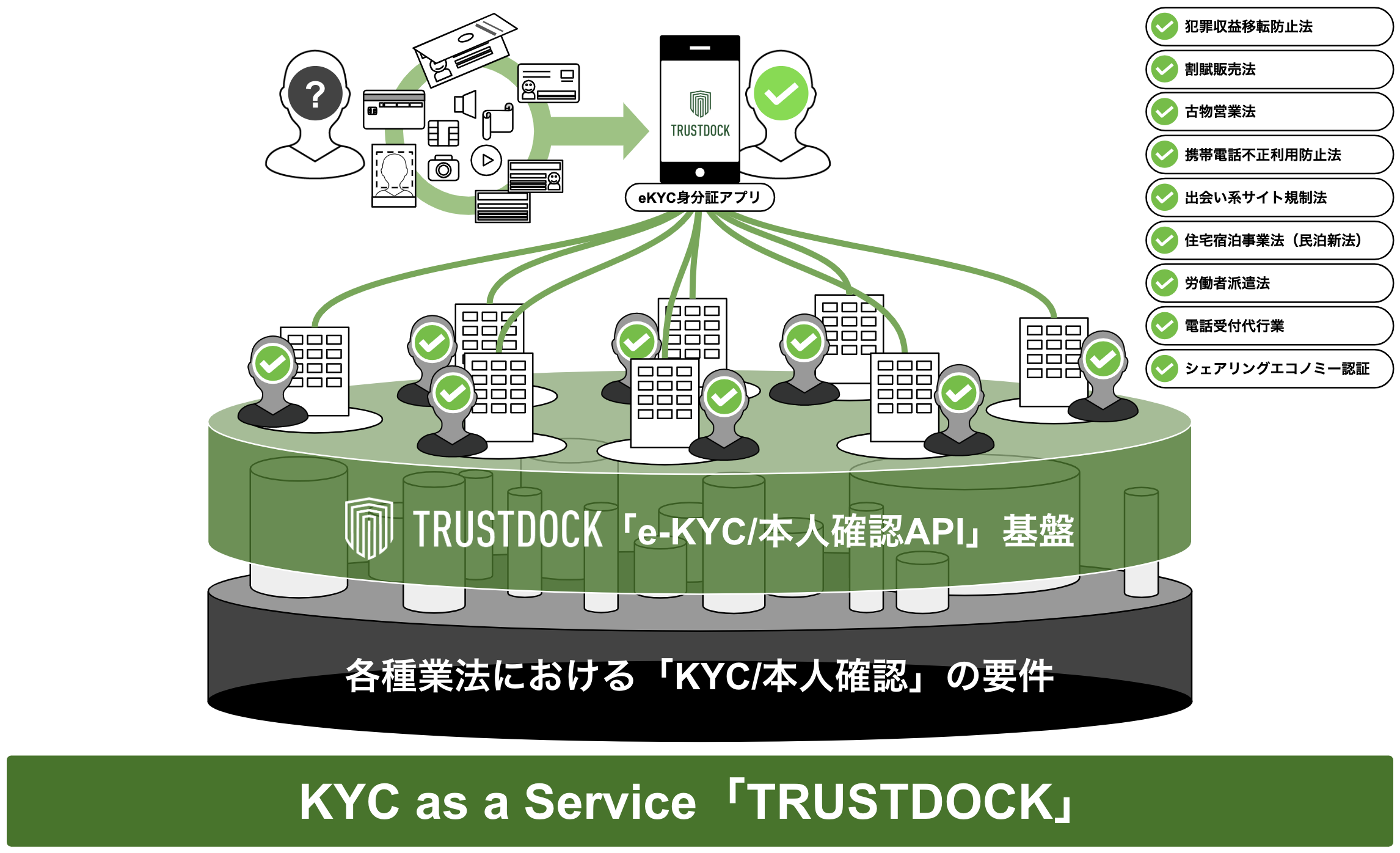 KYC as a Service「TRUSTDOCK」が提供している、日本で唯一のデジタル身分証アプリとe-KYC/本人確認APIサービスでは、犯罪収益移転防止法をはじめ、携帯電話不正利用防止法、古物営業法、労働者派遣法、出会い系サイト規制法、民泊新法など、各種法律に準拠したKYCをAPI組み込みのみで実現します。